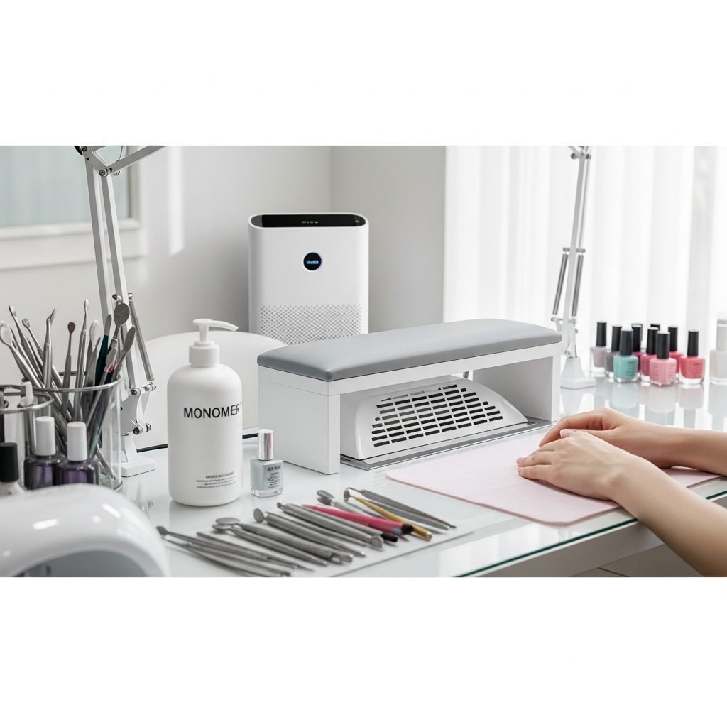 Professional source capture units use adjustable hoods or ventilated nail tables to pull monomer fumes and filing dust away from the technician and client. These are vital for acrylic services.